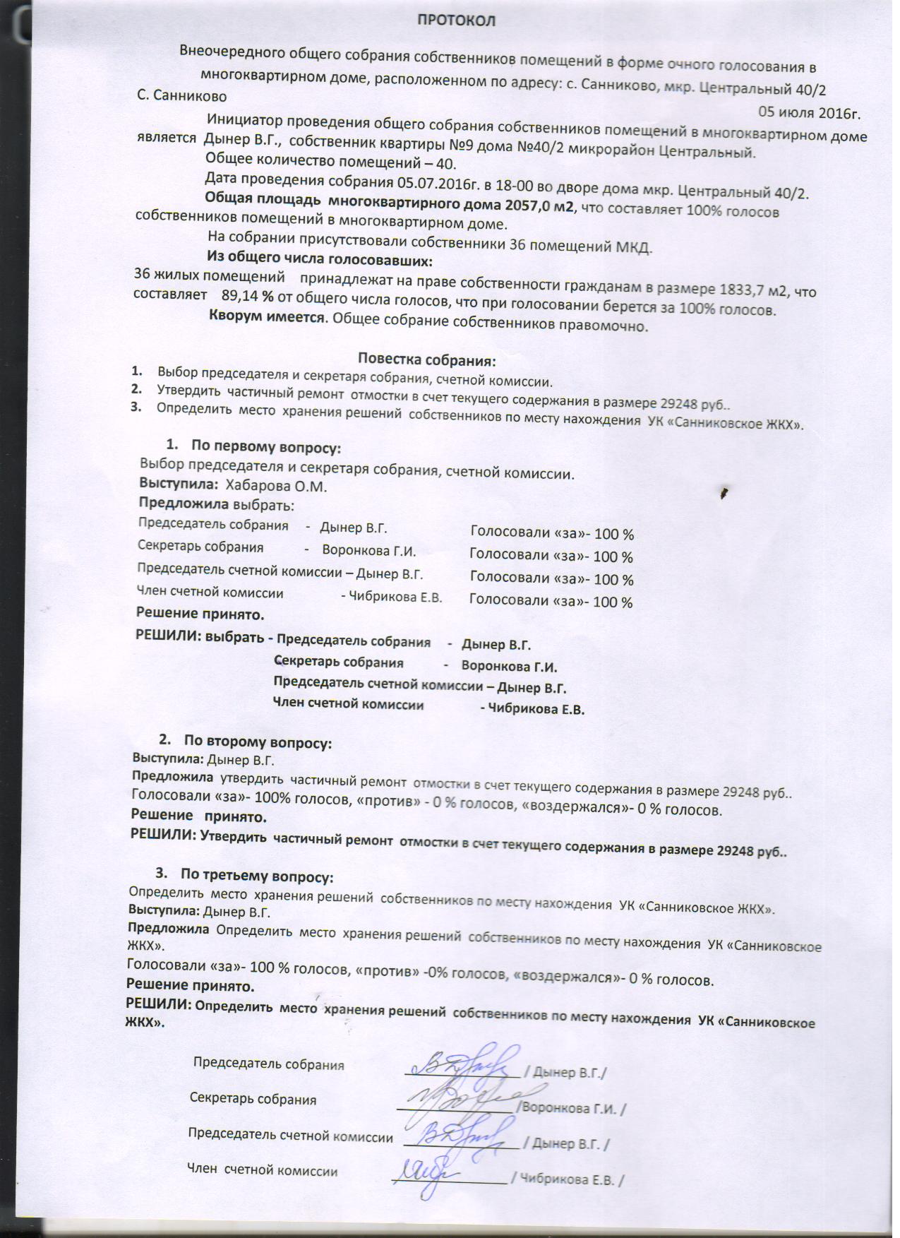мкр. Центральный №40-2 Протокол Центральный, 40-2 от 05.07.2016