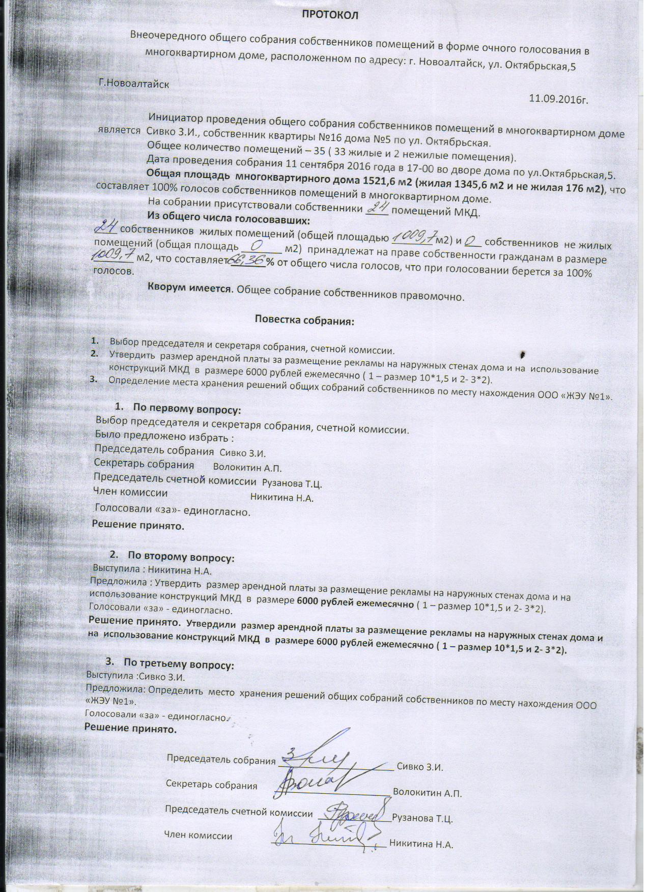 Ул. Октябрьская №5 Протокол Октябрьская, 5 от 11.09.2016