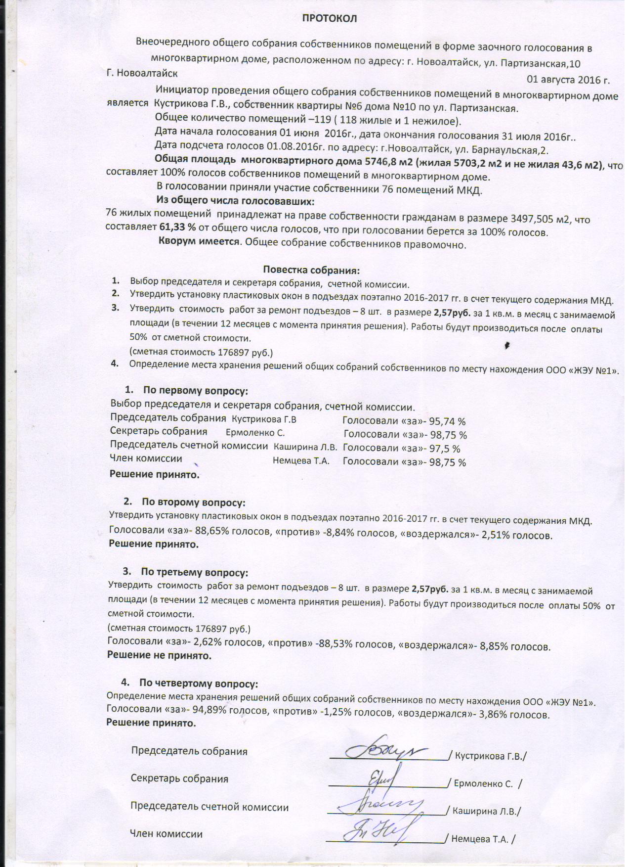Ул. Партизанская №10 Протокол Партизанская, 10 01.08.2016