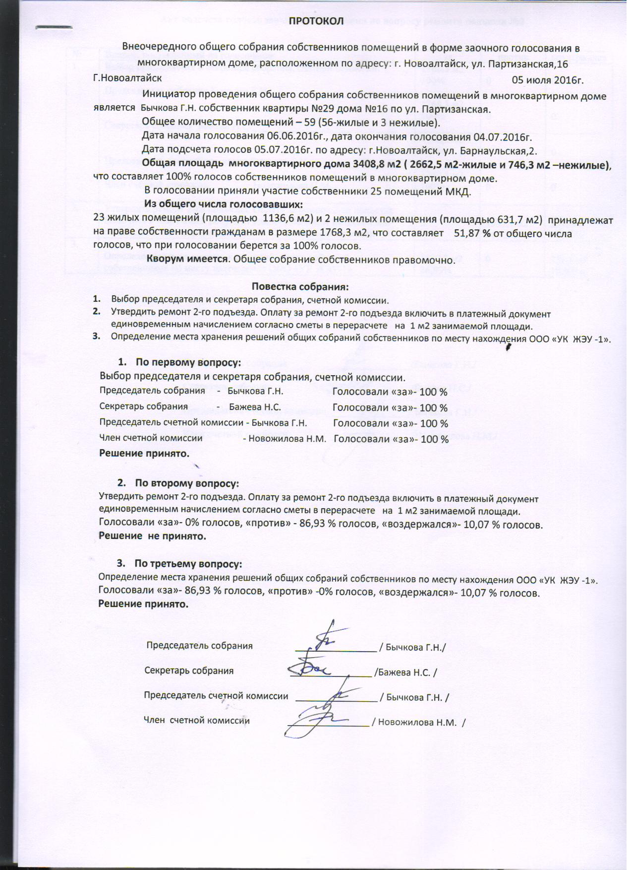 Ул. Партизанская №16 Протокол Партизанская, 16 от 05.07.2016