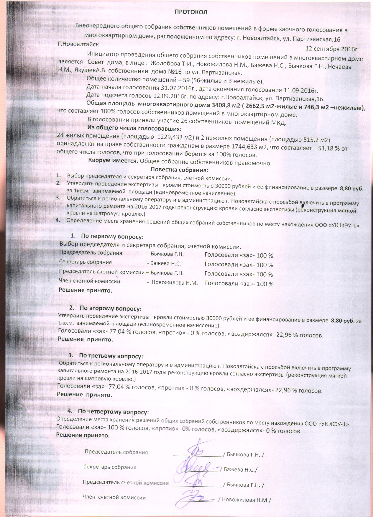 Ул. Партизанская №16 Протокол №1 Партизанская, 16 от 12.09.2016